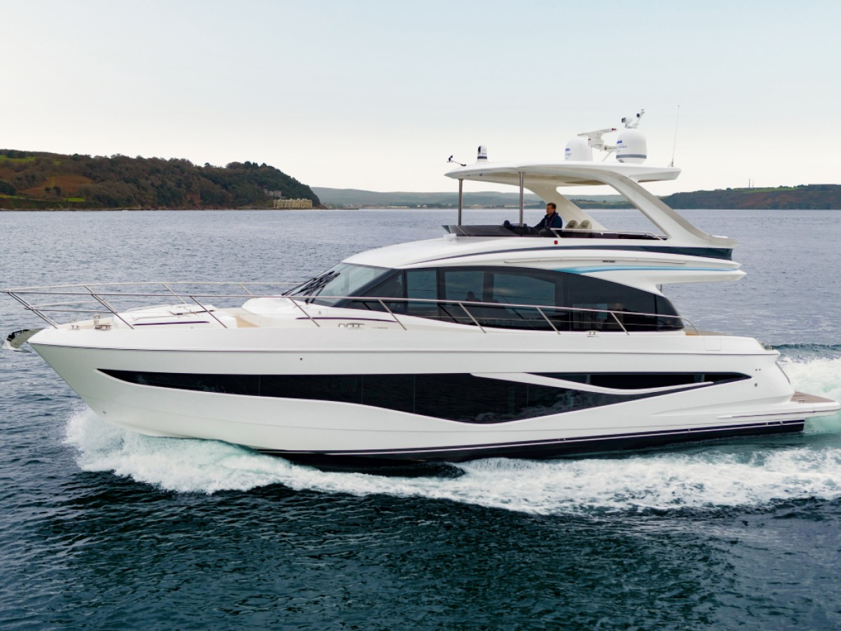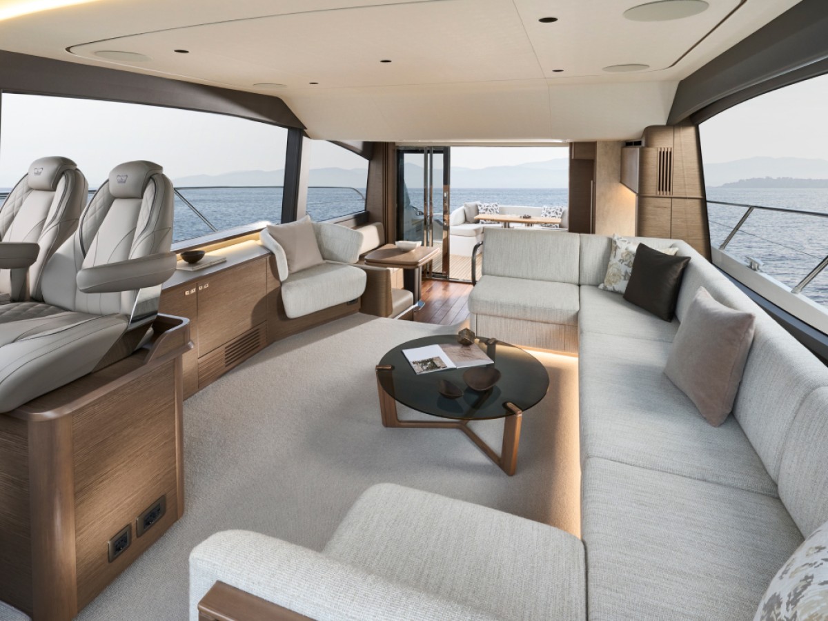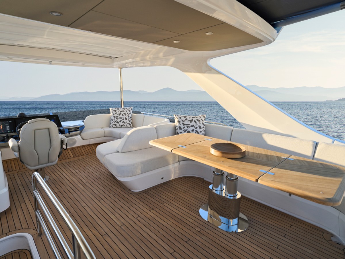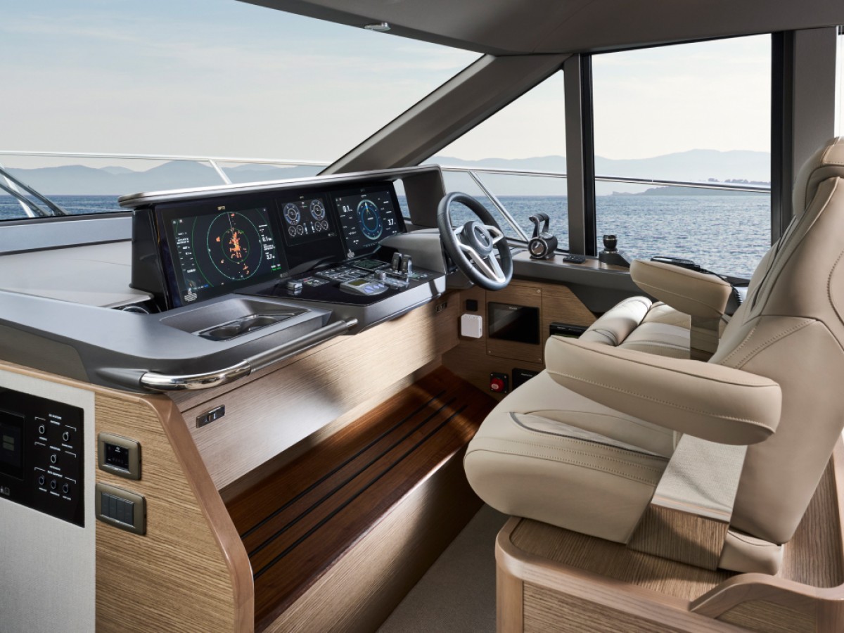- 16” colour MFD incorporating GPS/chartplotter, log, echo-sounder - 9” MFD screen displaying engine instrumentation (including fuel levels and fuel flow) - Power-assisted electro-hydraulic steering - Adjustable steering wheel - High-speed magnetic compass - Electronic engine controls - Trim tab controls with indicators - Bow thruster control - Electric anchor winch remote control - Autopilot - Speed and distance log - Echo sounder with alarm - VHF with DSC R/T with intercom - Remote control searchlight - Horn button (to operate twin electric horns) - Audible and visual alarm engine warning system - Audible and visual alarm for bilge pumps - Engine room fire extinguisher warning system - Footrest