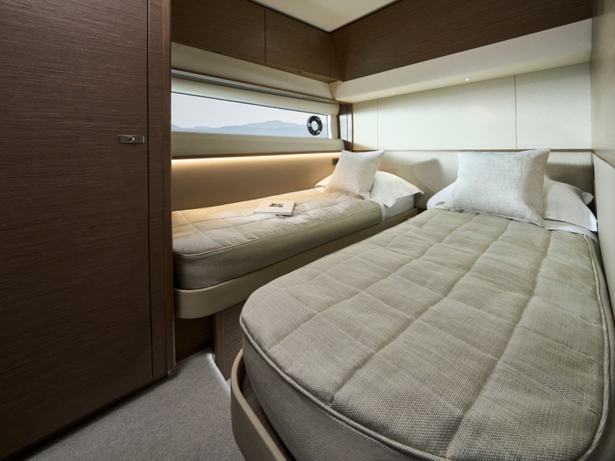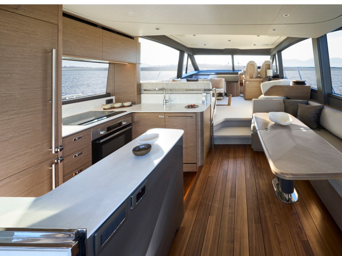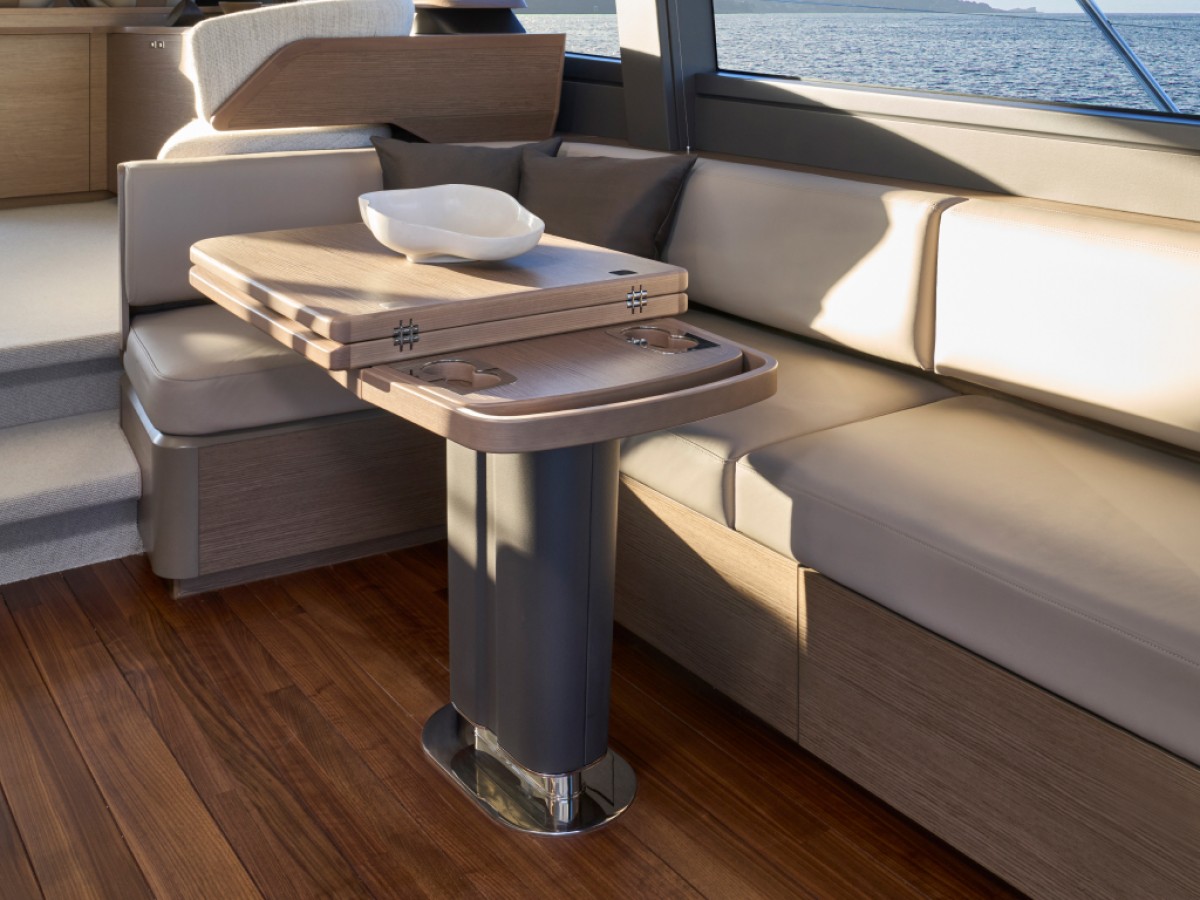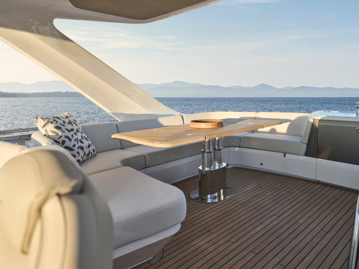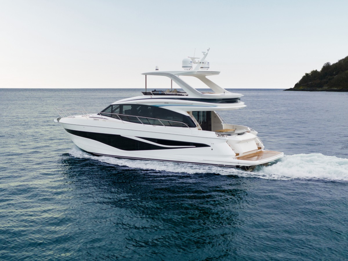 - 16” colour MFD incorporating GPS/chartplotter, log, echo-sounder - 9” MFD screen displaying engine instrumentation (including fuel levels and fuel flow) - Power-assisted electro-hydraulic steering - Adjustable steering wheel - High-speed magnetic compass - Electronic engine controls - Trim tab controls with indicators - Bow thruster control - Electric anchor winch remote control - Autopilot - Speed and distance log - Echo sounder with alarm - VHF with DSC R/T with intercom - Remote control searchlight - Horn button (to operate twin electric horns) - Audible and visual alarm engine warning system - Audible and visual alarm for bilge pumps - Engine room fire extinguisher warning system - Footrest