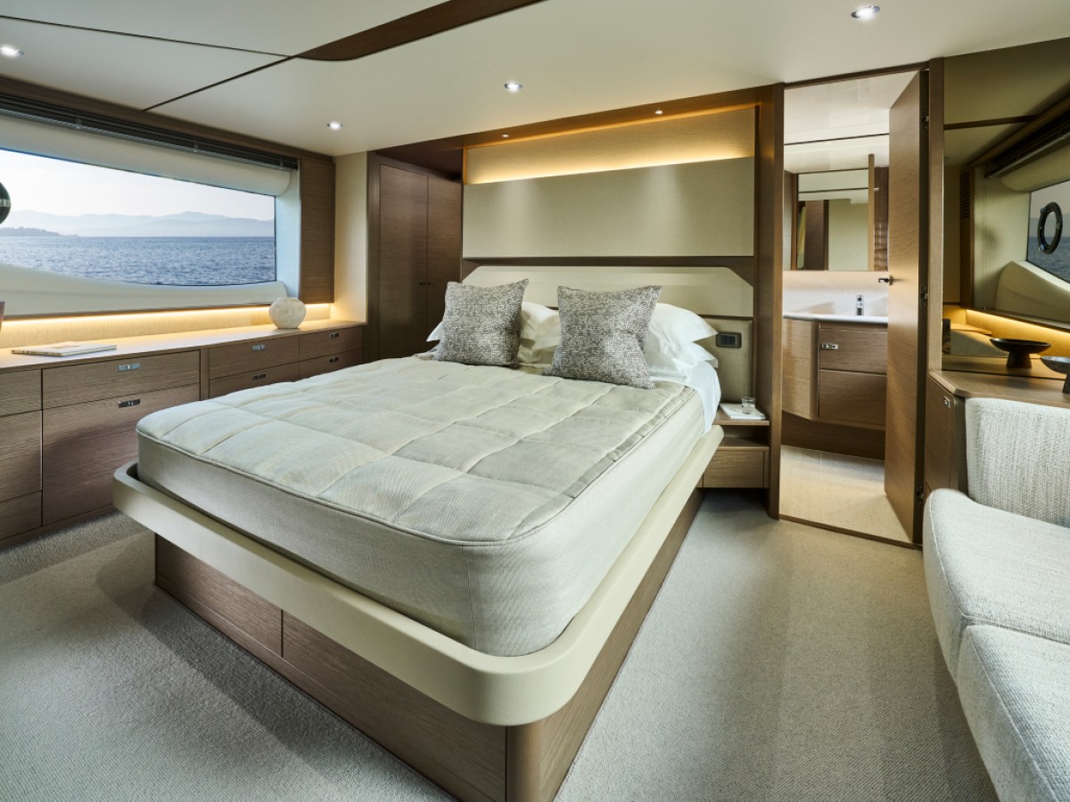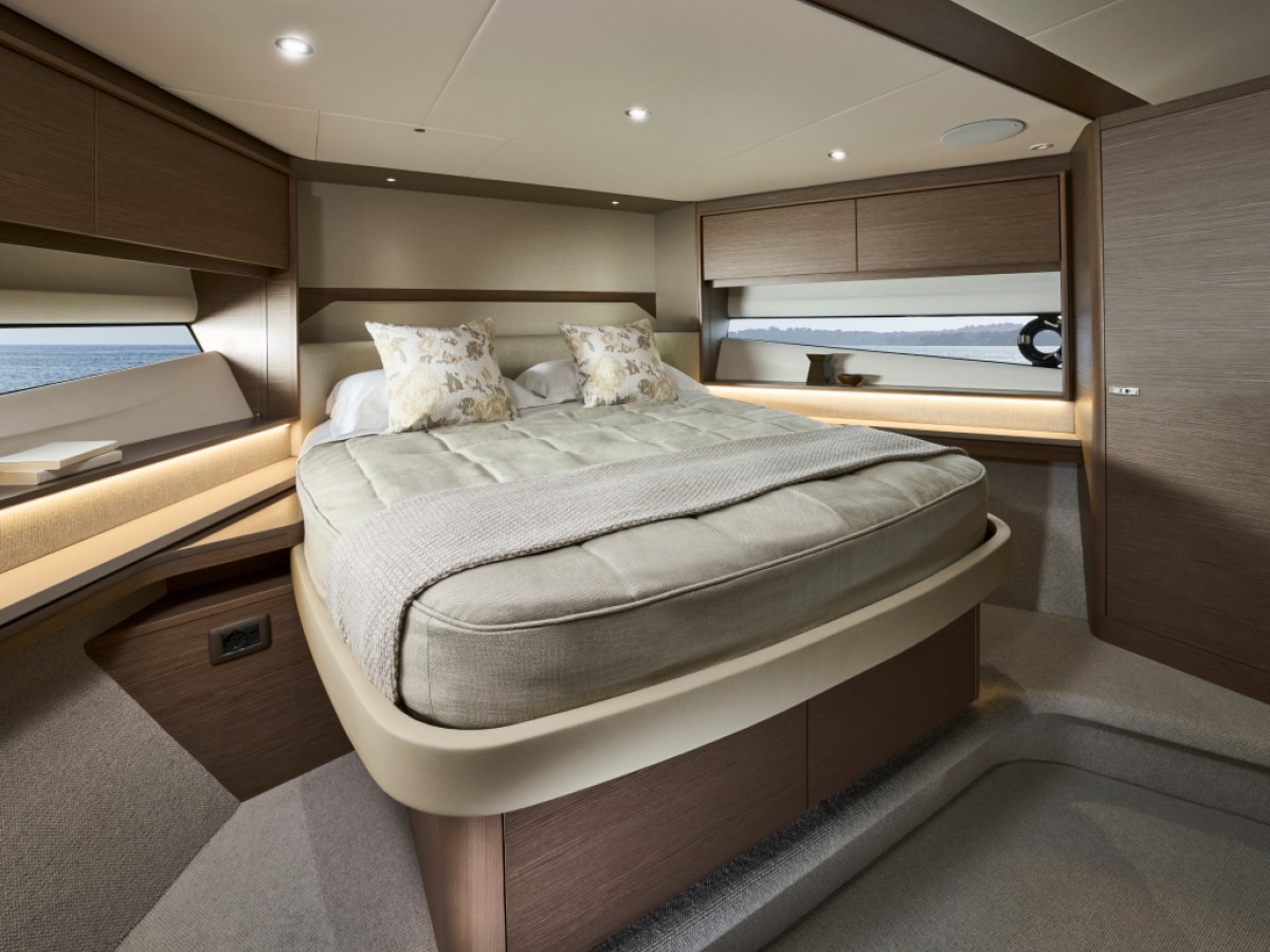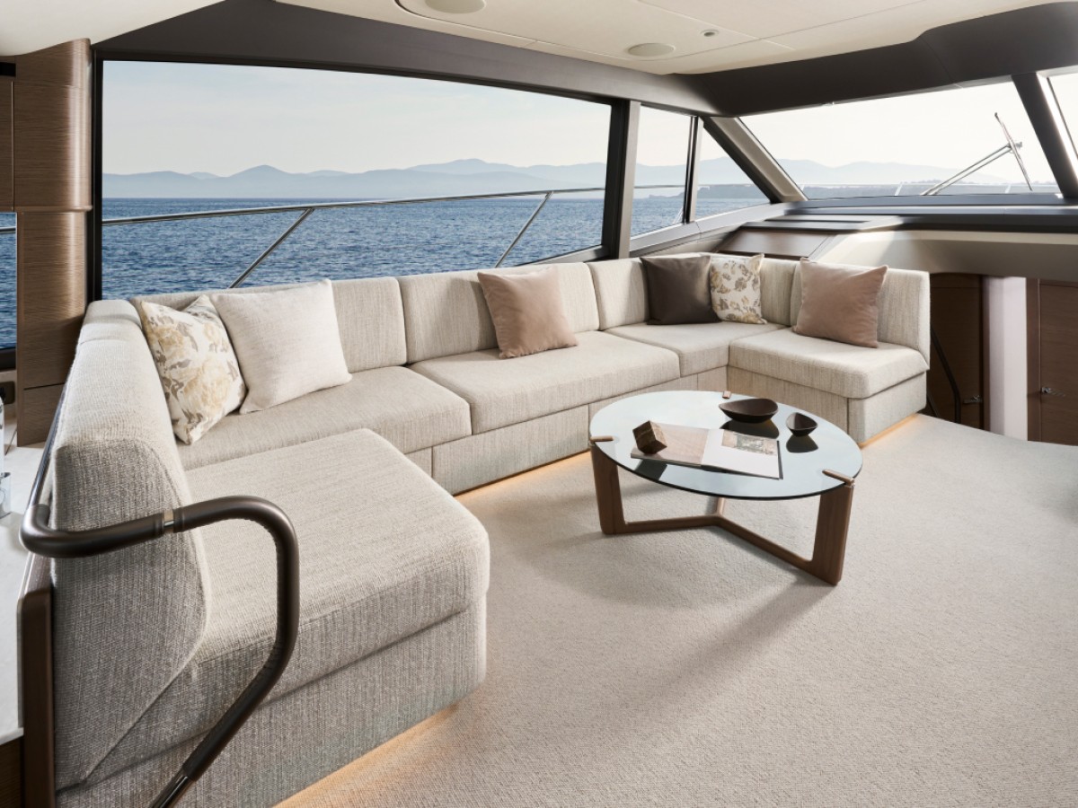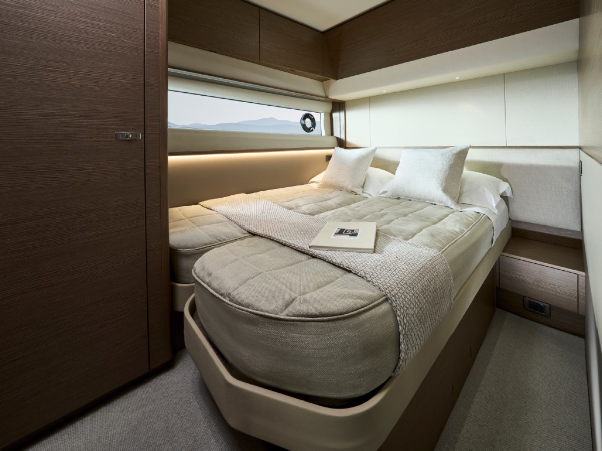 - 16” colour MFD incorporating GPS/chartplotter, log, echo-sounder - 9” MFD screen displaying engine instrumentation (including fuel levels and fuel flow) - Power-assisted electro-hydraulic steering - Adjustable steering wheel - High-speed magnetic compass - Electronic engine controls - Trim tab controls with indicators - Bow thruster control - Electric anchor winch remote control - Autopilot - Speed and distance log - Echo sounder with alarm - VHF with DSC R/T with intercom - Remote control searchlight - Horn button (to operate twin electric horns) - Audible and visual alarm engine warning system - Audible and visual alarm for bilge pumps - Engine room fire extinguisher warning system - Footrest