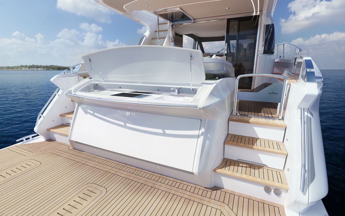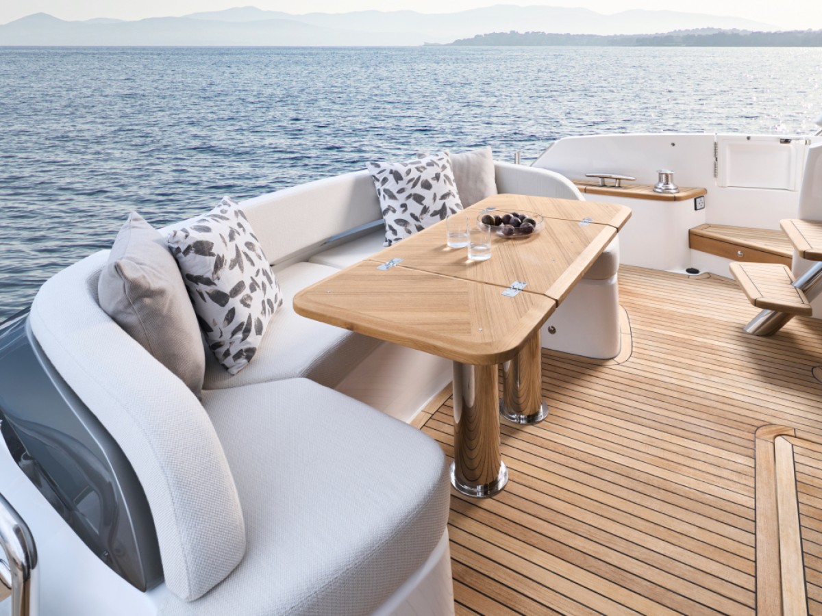 - Teak-laid transom platform, transom steps, cockpit deck, flybridge stairway and steps to side deck