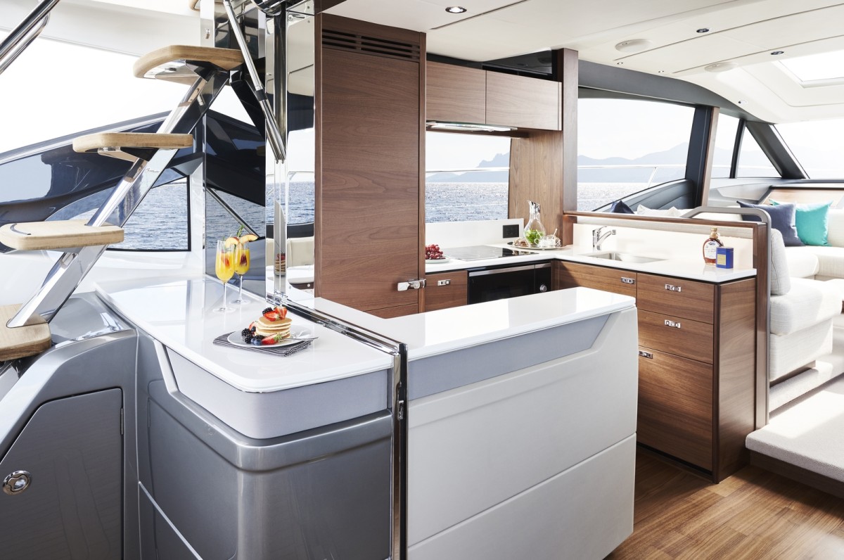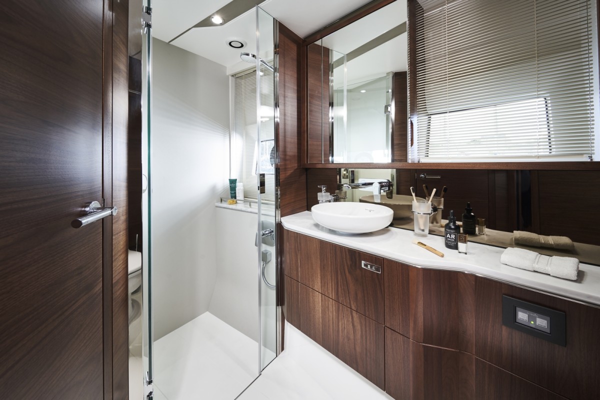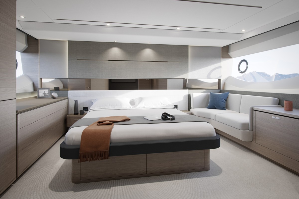 Powerful yet elegant, the new S62's sleek exterior styling presents a dynamic, agile stance. With an optimised hull form spearheading her efficiency, her MAN V8 1200 engines mean you can experience speeds up to 38 knots. When at anchor her electro-hydraulic bathing platform creates a convenient launch system for a 3.3m tender, a jet ski, or simply a secluded swimming platform. Her sociable galley aft arrangement features an open-plan dining area with sliding doors and a fully opening window leading out to the cockpit. Below deck, six guests are comfortably accommodated across an en suite full-beam owner’s stateroom and two further guest cabins with the option of an additional crew cabin aft.