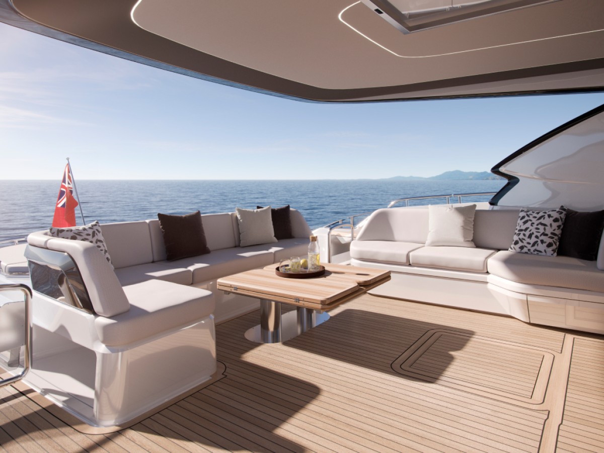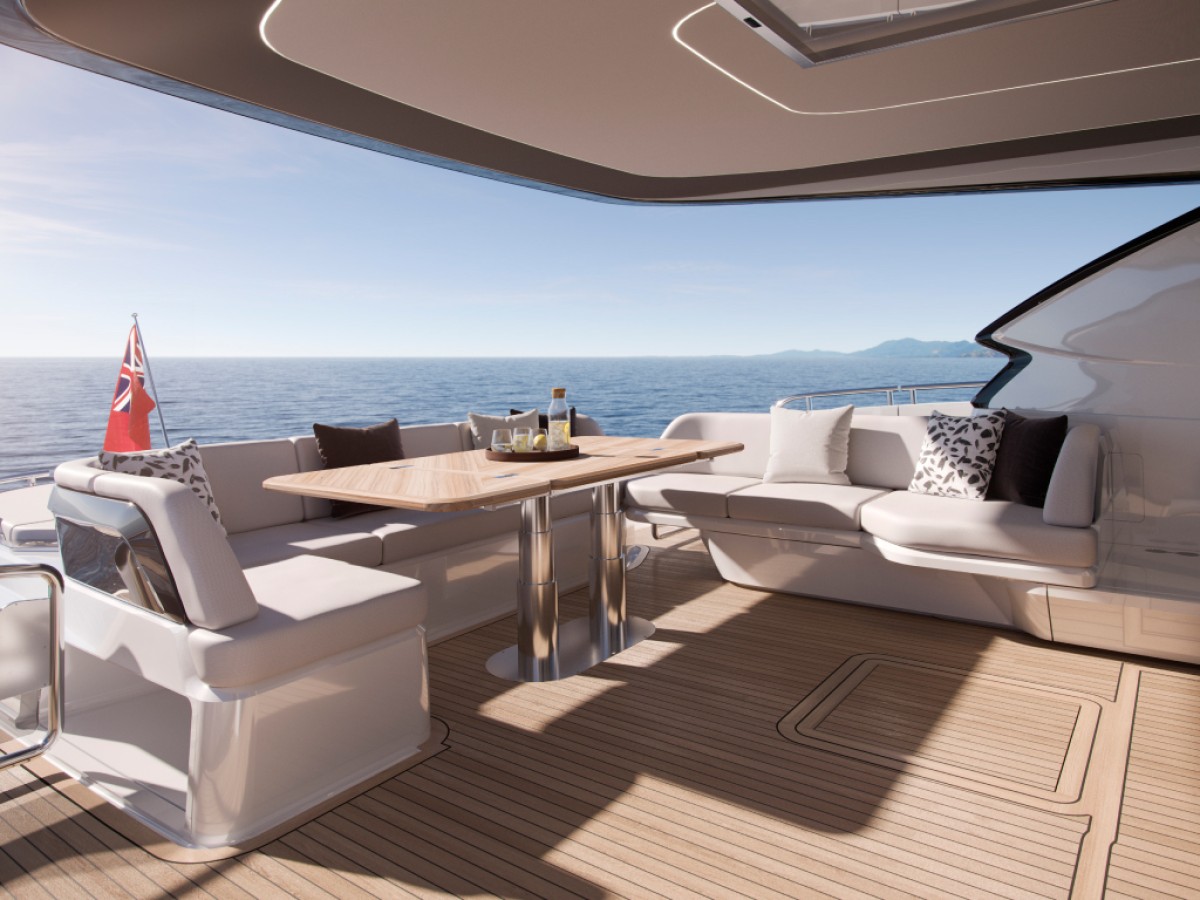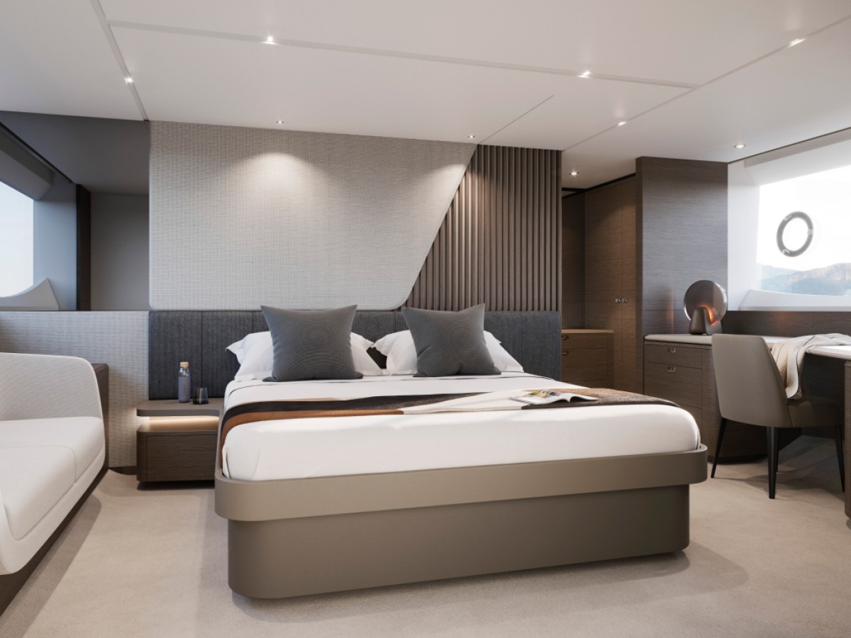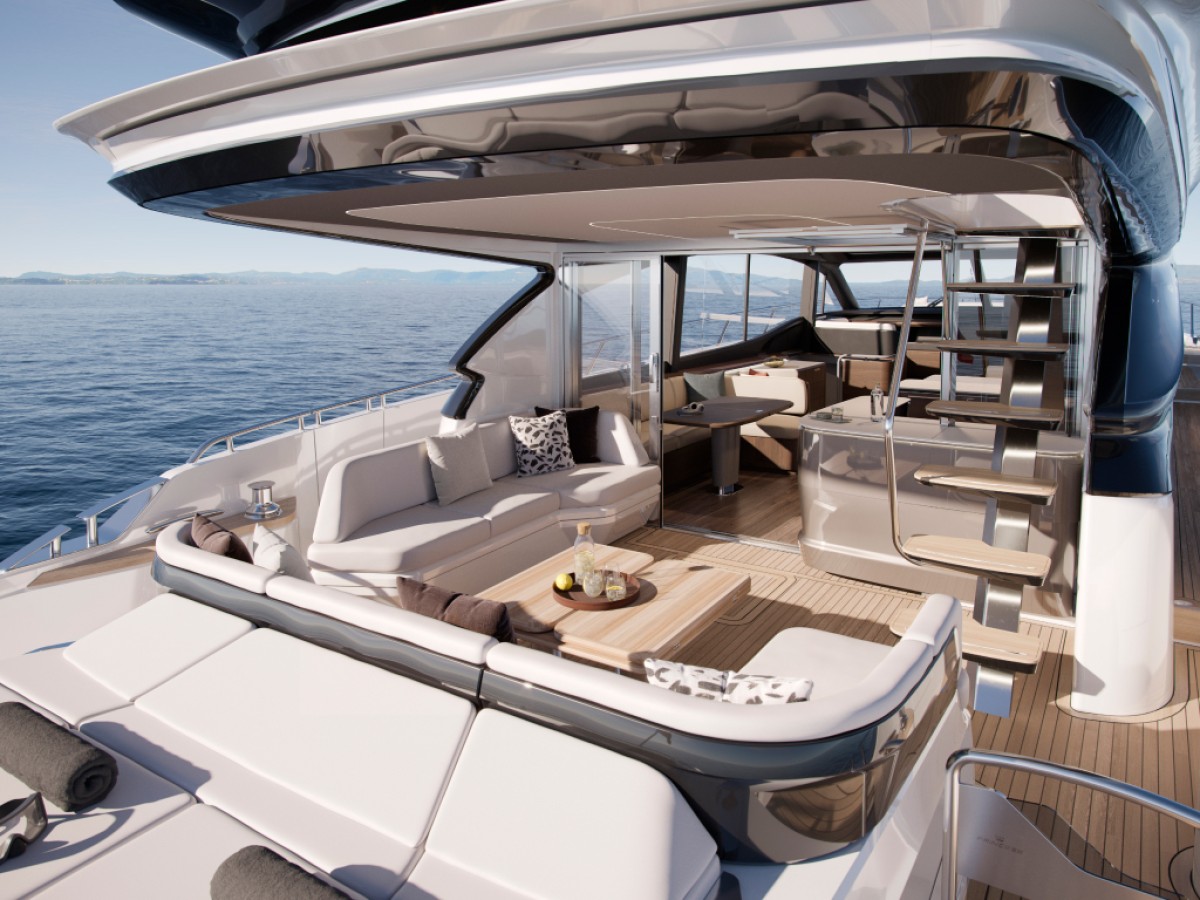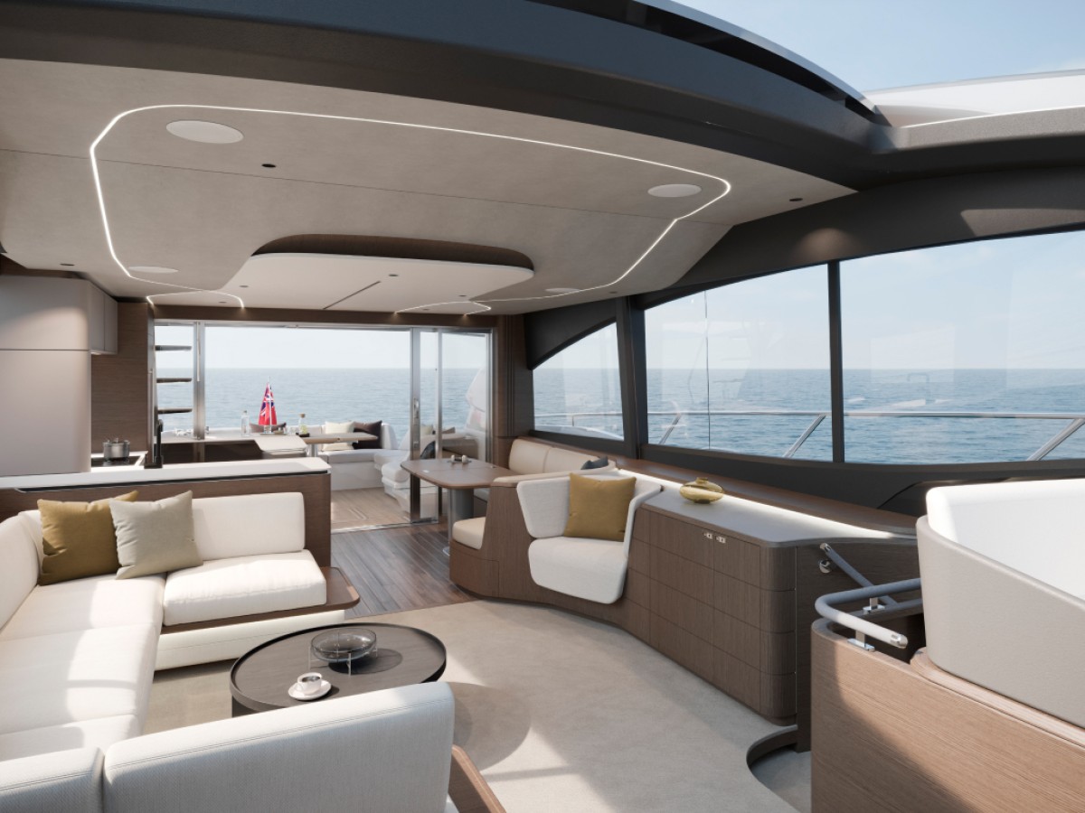 The Princess S74 is the latest evolution of the S Class range, set to launch in 2027. Developed from the award-winning S72, the S74 combines dynamic performance with enhanced exterior deck layouts and a refined interior specification. The exterior features full-length hull windows and updated hull graphics, emphasising the yacht’s sporting profile. The cockpit offers reconfigurable seating arrangements, while the integrated sunpad is positioned above a tender garage capable of accommodating a 3.9 m tender, launched via an electro-hydraulic bathing platform. The foredeck provides dedicated sunbathing and seating areas, and the sportbridge is equipped with a twin helm station, dining seating, folding tables and a wet bar with barbecue. The main deck is arranged around multiple lounge and dining configurations and includes a sideboard with bottle and glass storage, refrigeration, a 55-inch UHD LED television and Naim audio system. The helm station features dual-station instrumentation, adjustable twin seats and a starboard pantograph door. A centrally located galley supports extended cruising and is fully equipped with a four-zone induction hob, combi oven, full-height fridge freezer, dishwasher and icemaker. Accommodation is provided for up to eight guests in four cabins, including a full-beam Owner’s Stateroom with private staircase, en-suite bathroom and panoramic hull windows. Additional accommodation includes a forward en-suite stateroom and two twin guest cabins. A separate crew cabin with two berths and en-suite facilities is also provided. Combining advanced engineering, intelligent space utilisation and a comprehensive specification, the Princess S74 delivers a refined balance of performance, comfort and functionality within the S Class range.