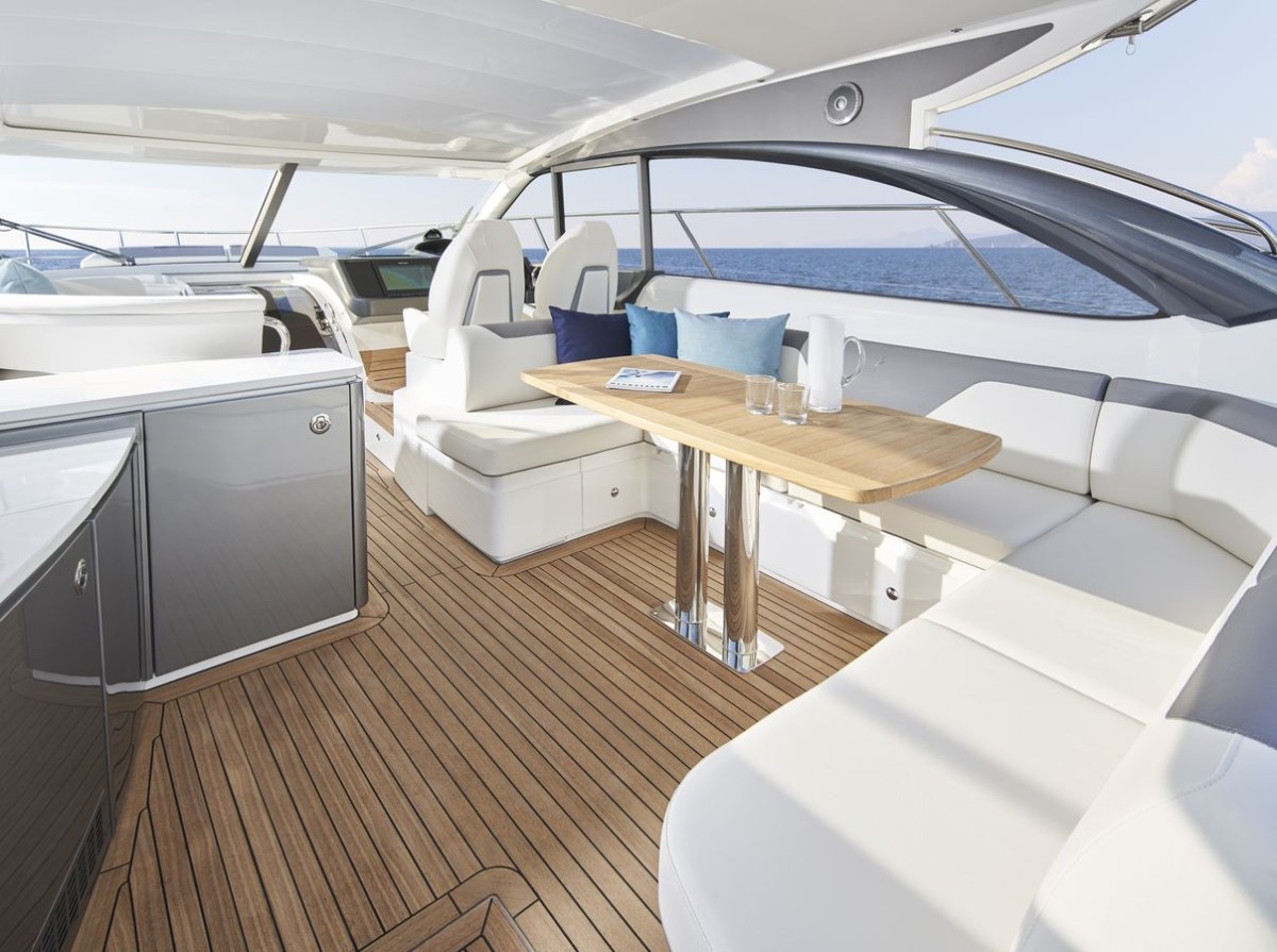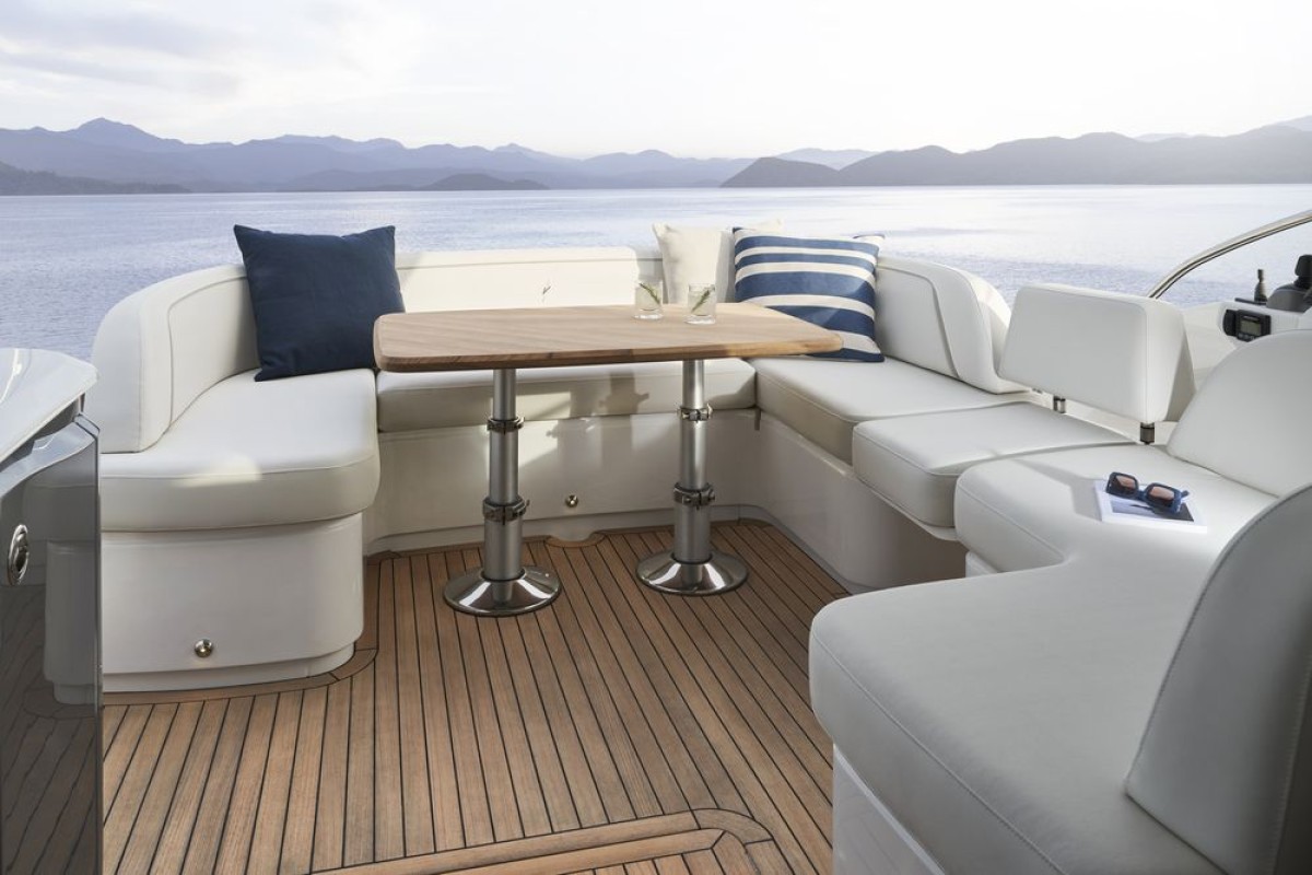 - Teak-laid transom platform, cockpit deck and steps to side decks