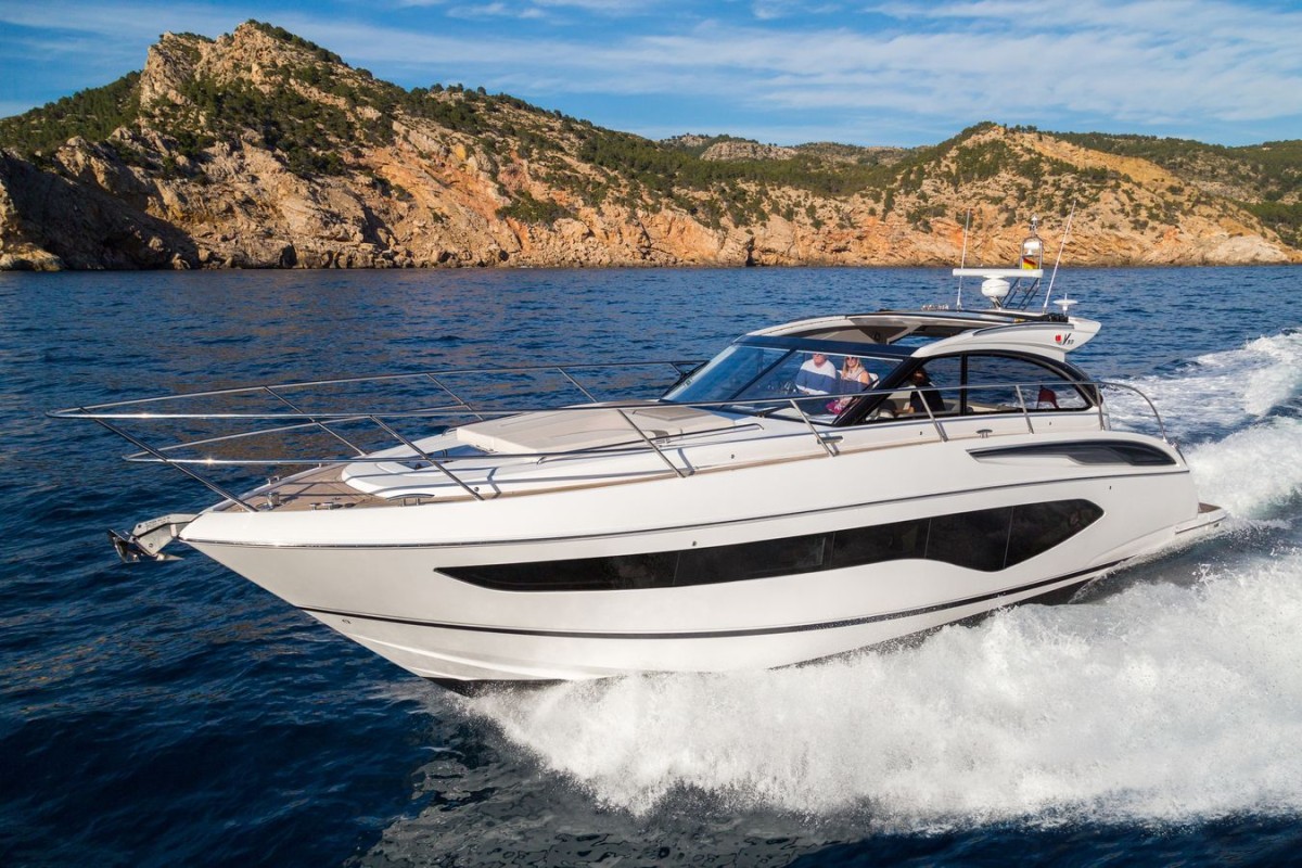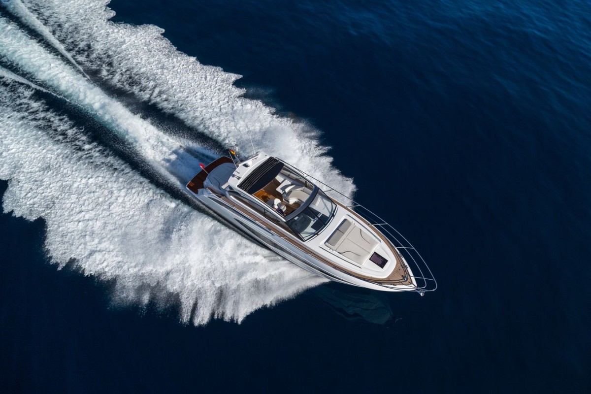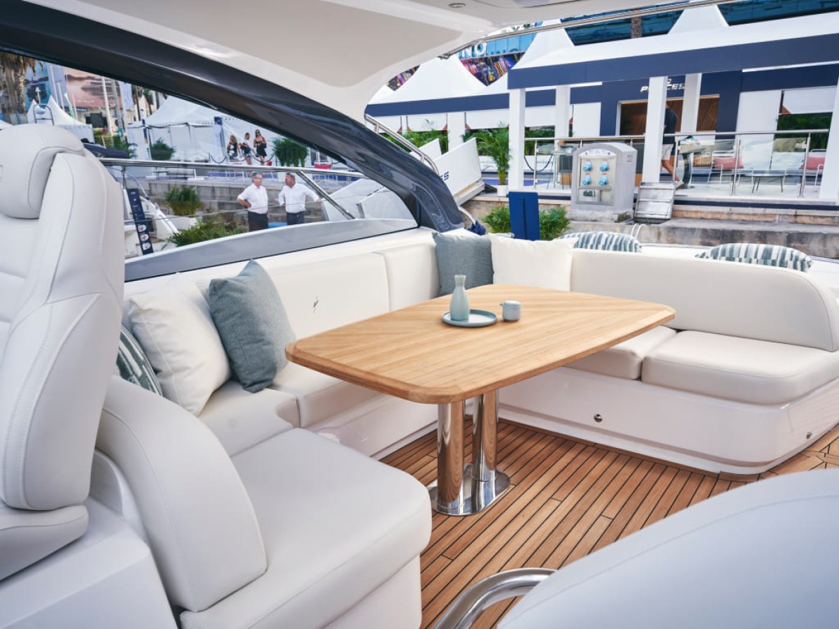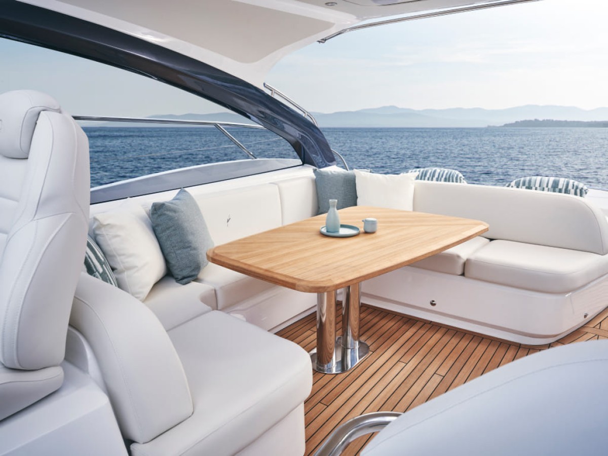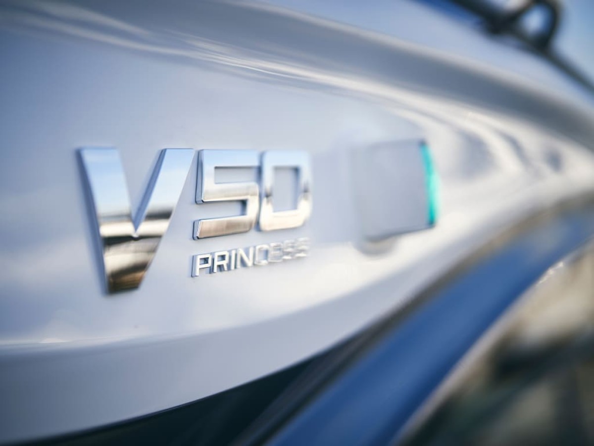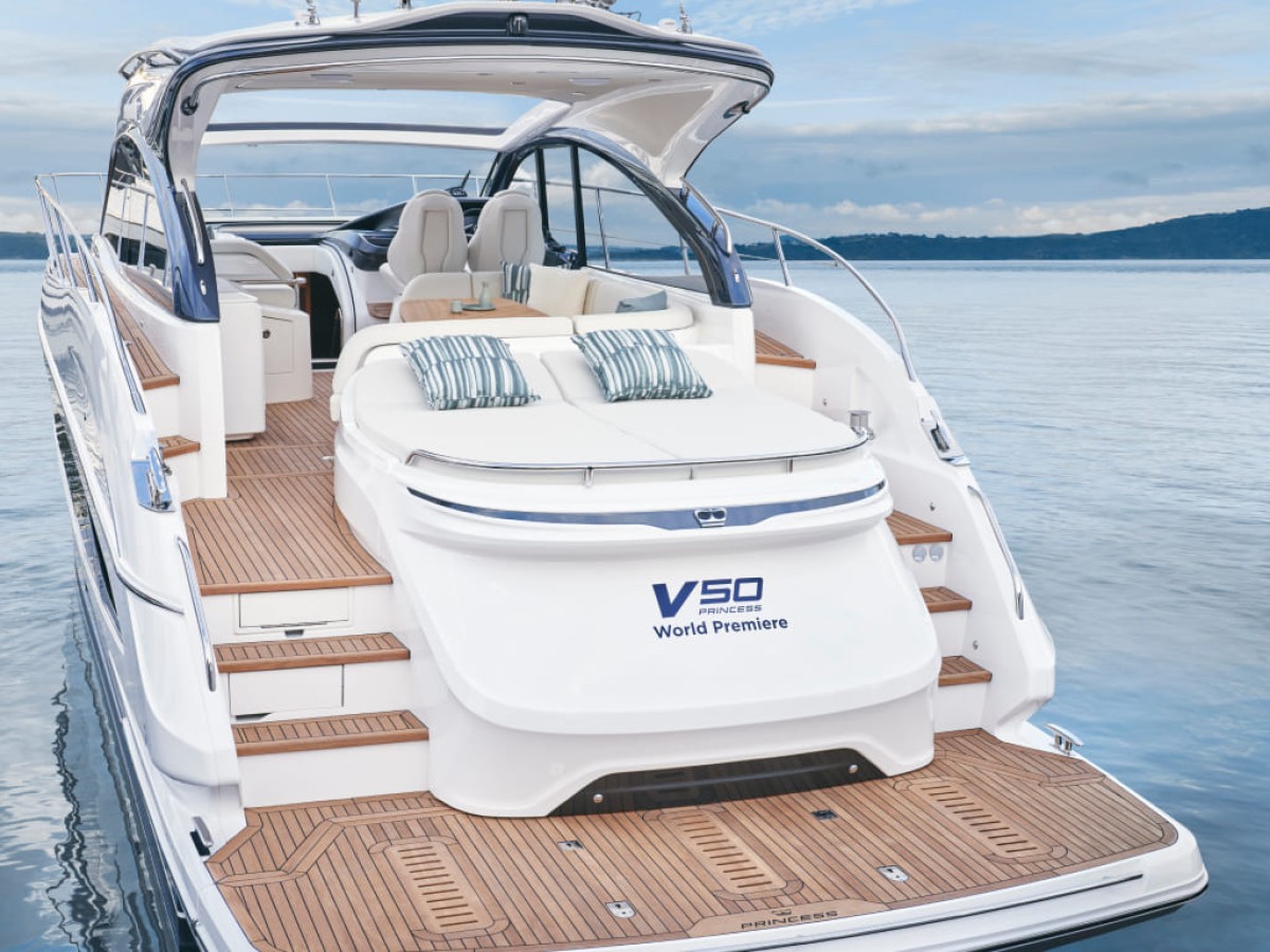 - The V50 Open also incorporates: electro-hydraulic bathing platform with dinghy chock system as standard, aft sunpad and tender garage (up to 3.25m), large seating area aft with fixed teak table, electrically operated canvas sun roof, wetbar including sink, coolbox and storage with optional barbecue, L-shaped seating opposite the helm and sliding door to lower accommodation