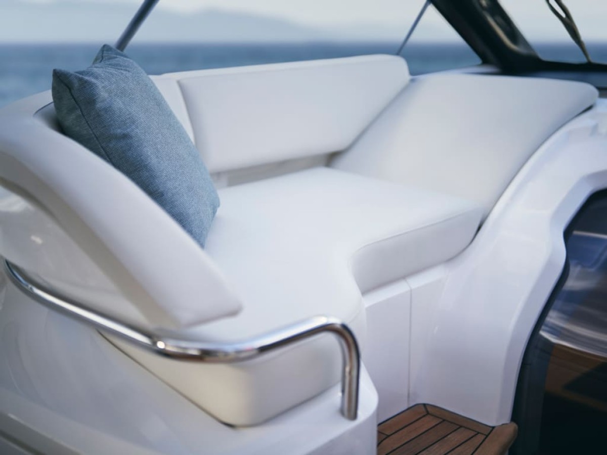 - Teak-laid transom platform, cockpit deck and steps to side decks