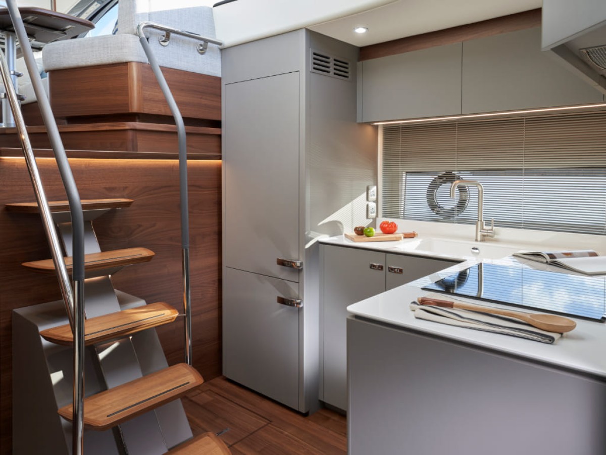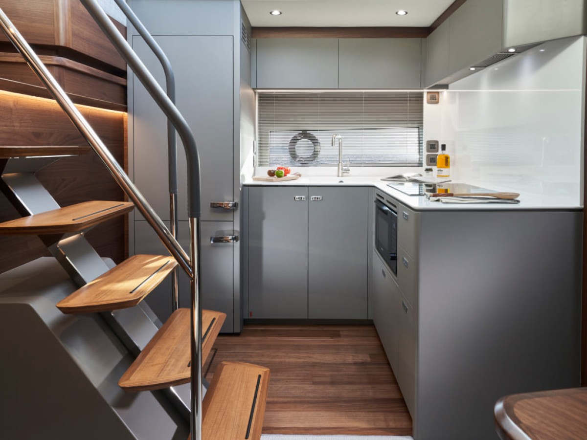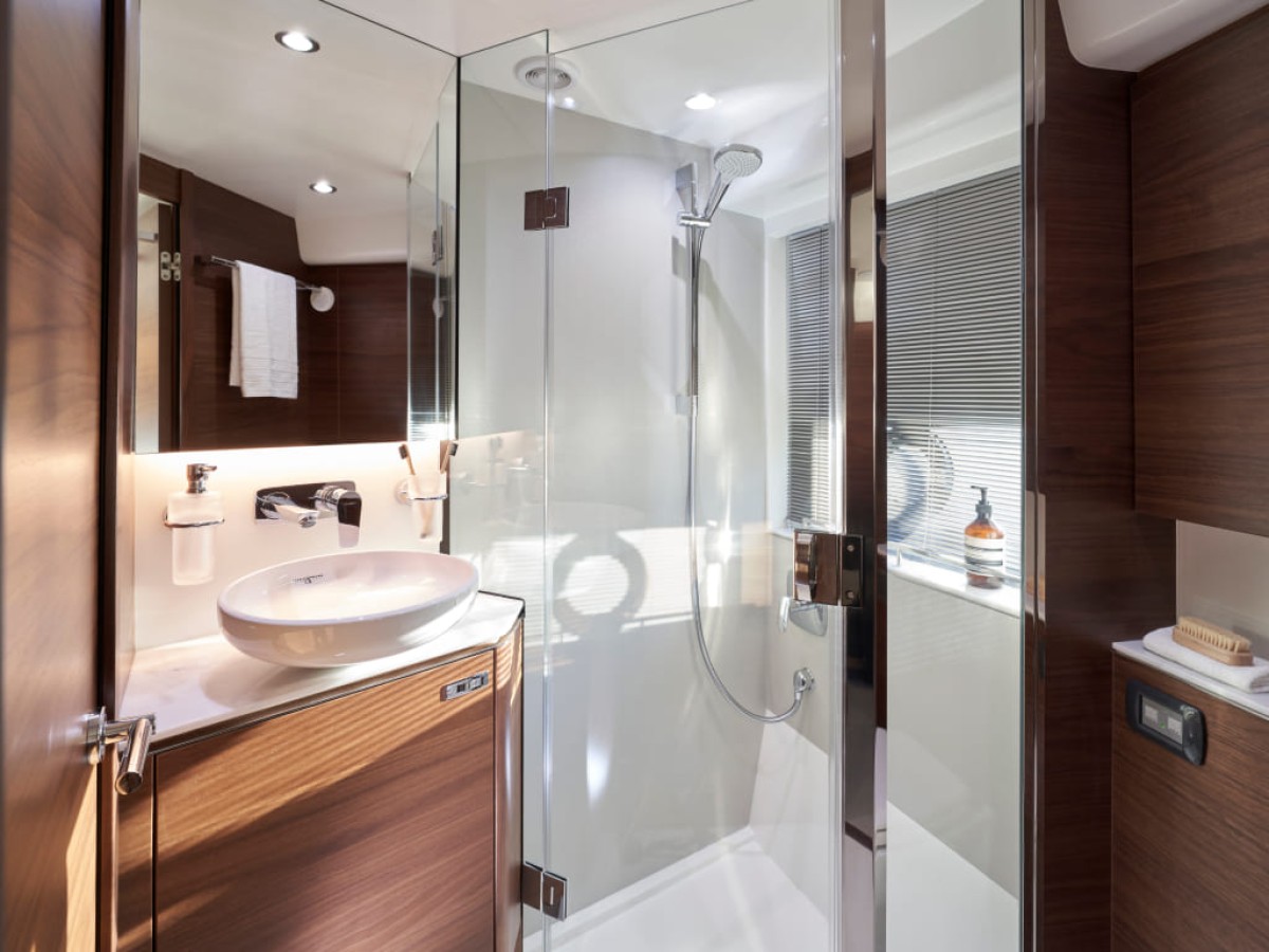- Transom gate leading to bathing platform with foldaway swimming ladder and hot and cold shower (with optional electro-hydraulic raise/lower mechanism and dinghy chock system)