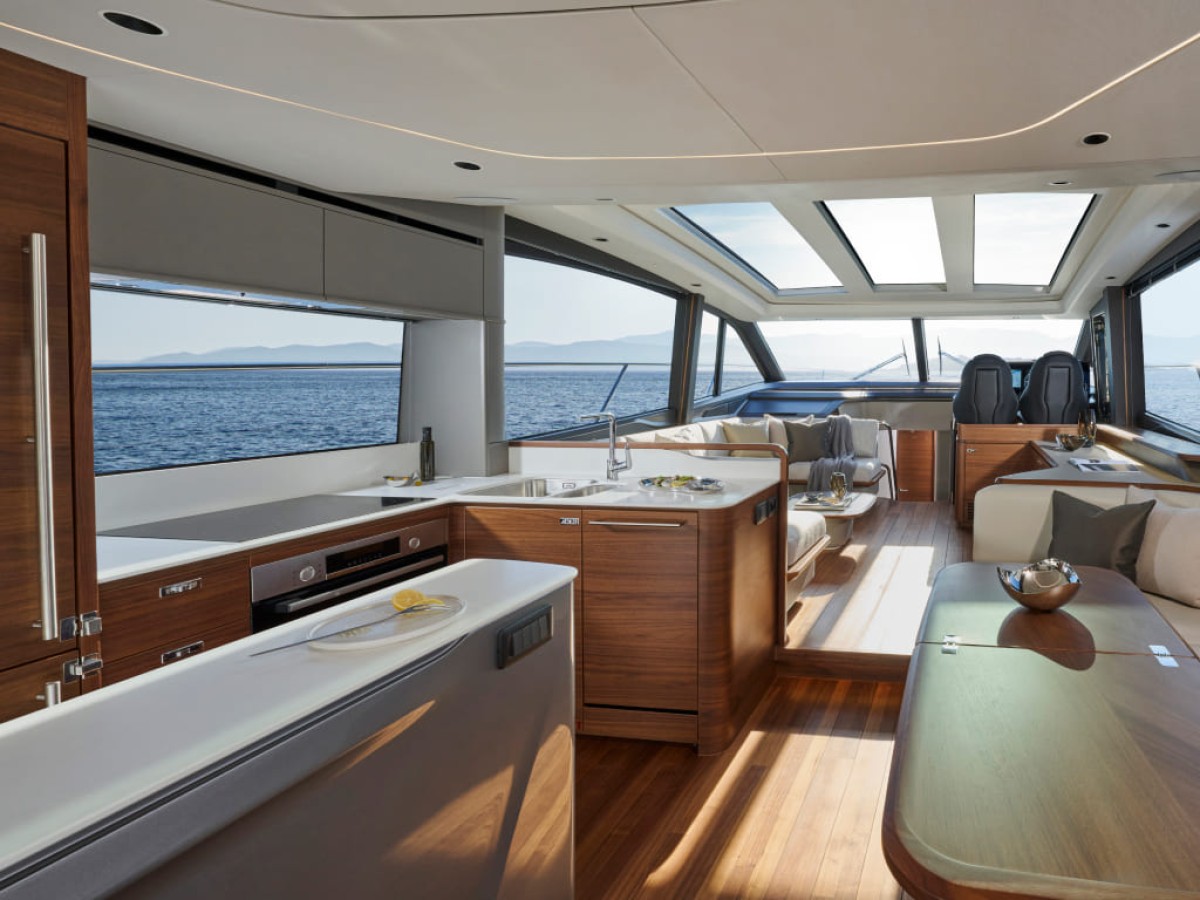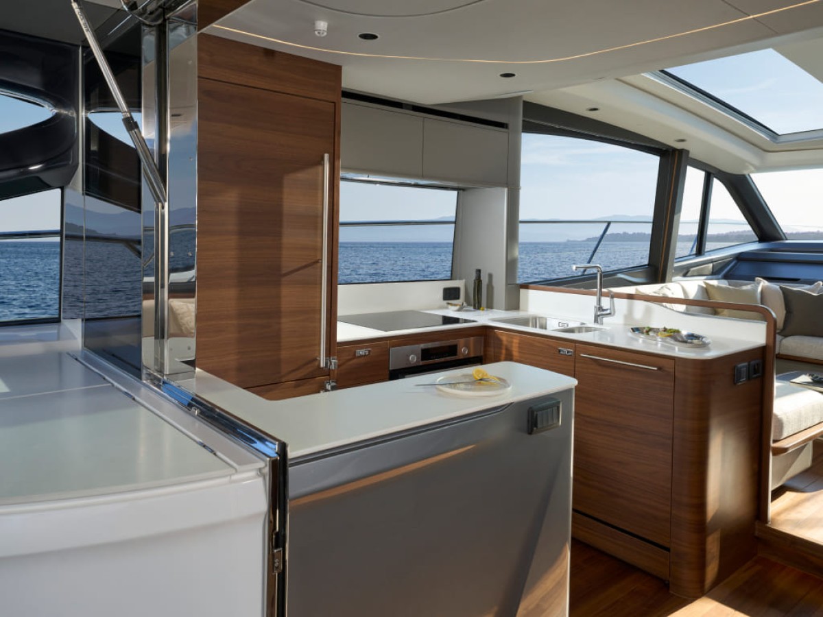 - Stainless steel framed sliding doors to aft cockpit with integrated opening window aft of galley
