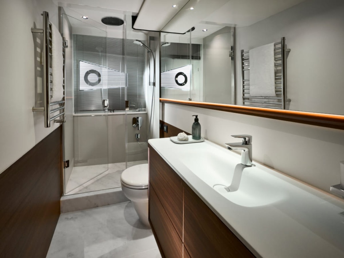 - Bathroom with shower, electric freshwater toilet and washbasin