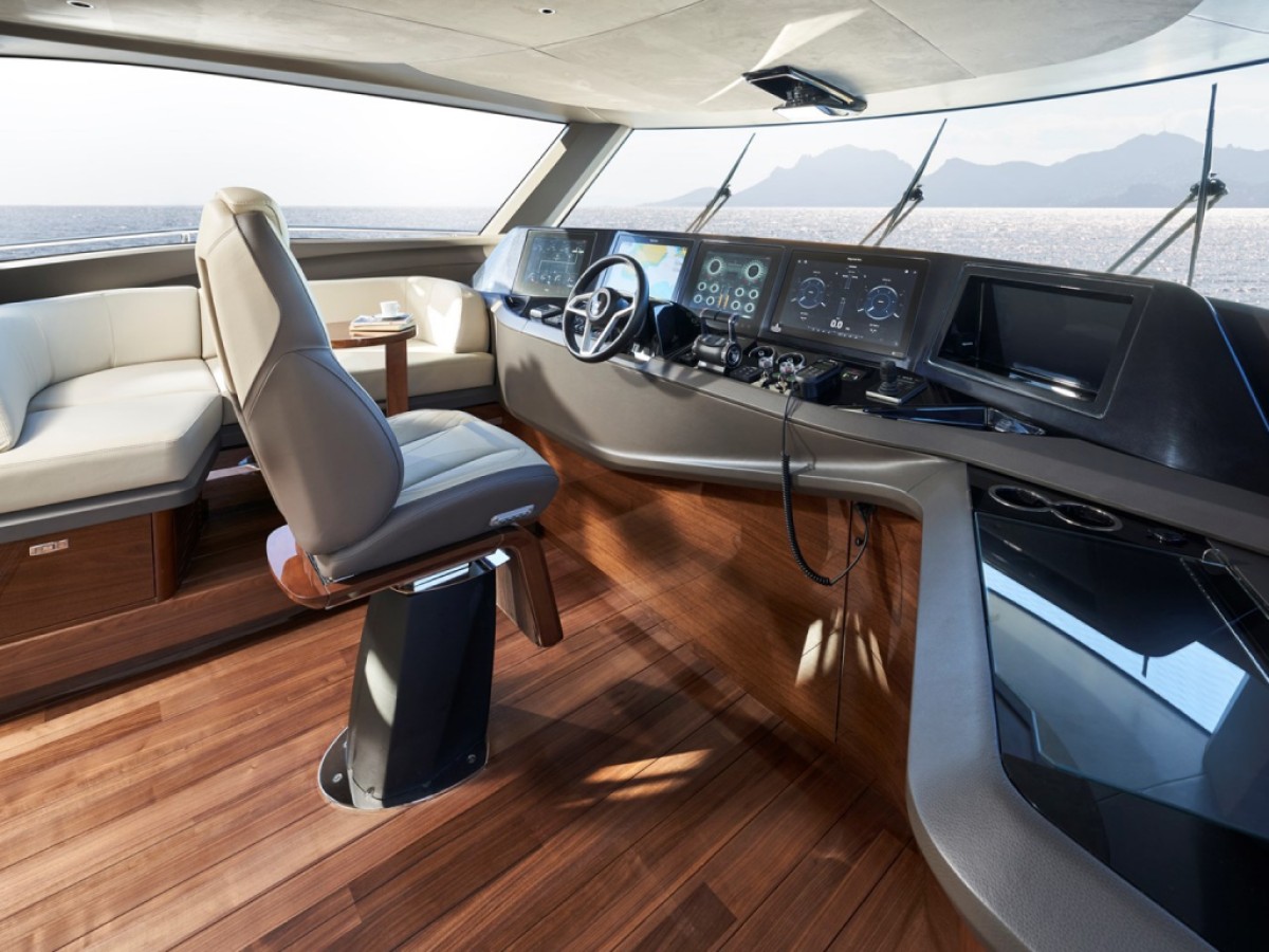 - Enclosed pilot house with central leather upholstered electric seat with fore, aft and height adjustment