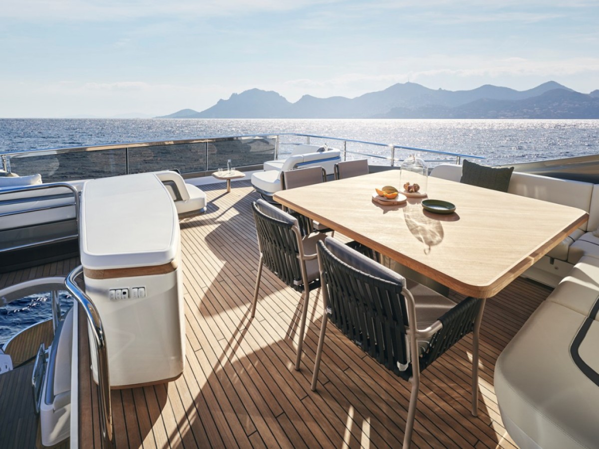 - Teak-laid transom platform, transom steps, cockpit deck, stairway to flybridge, side decks, steps to foredeck, flybridge aft sun deck and foredeckseating walkthrough areas
